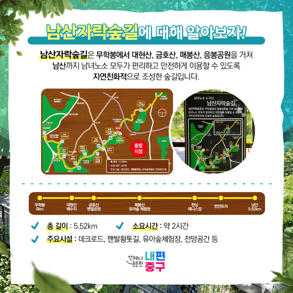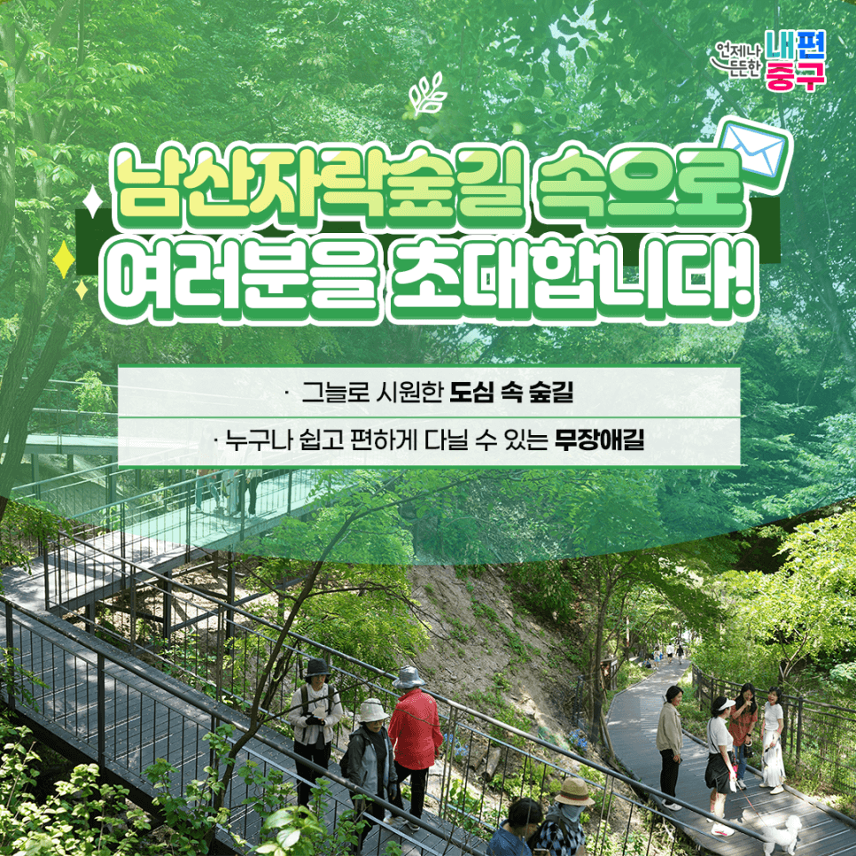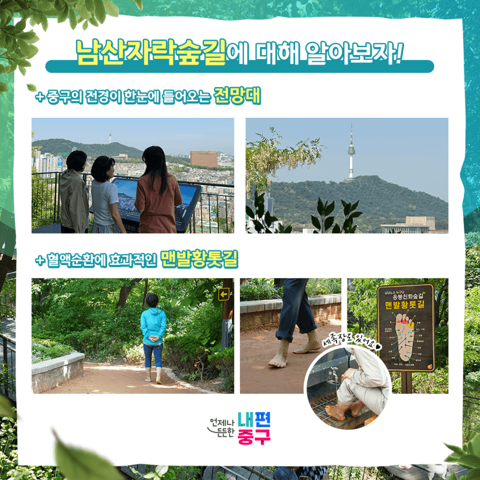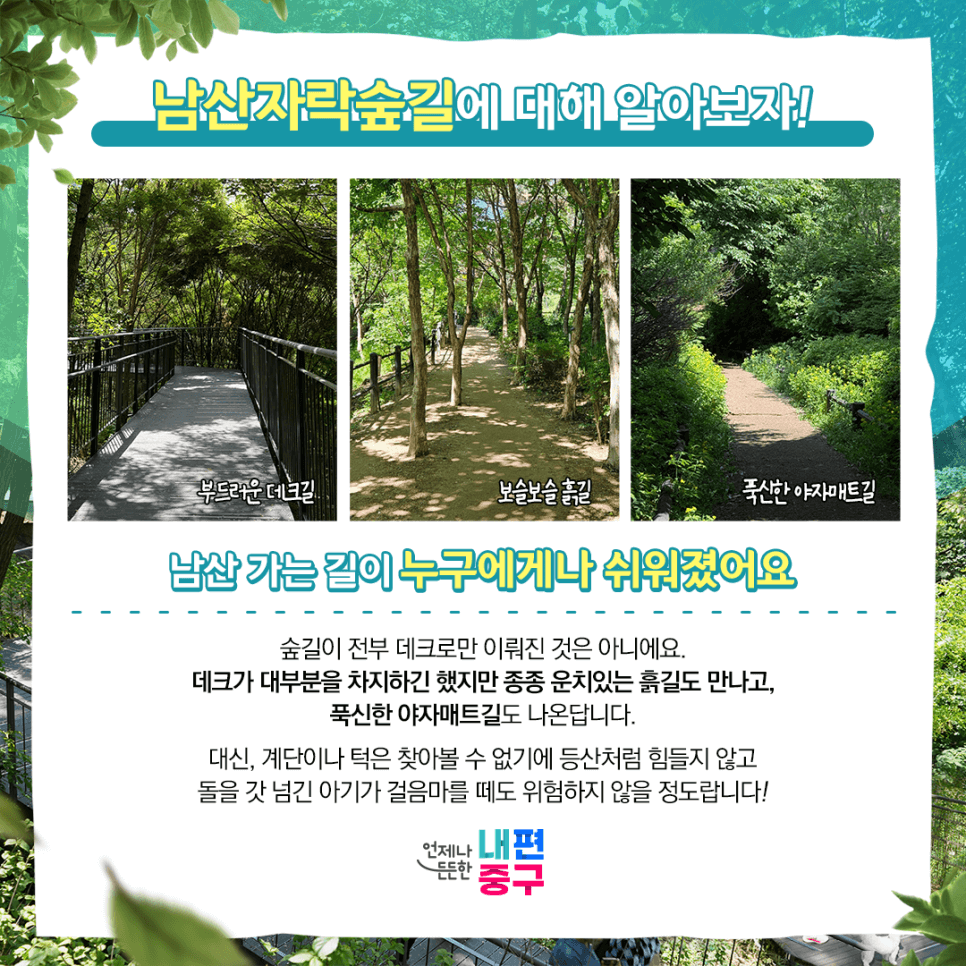 중구에 거주하는 누구든 혹은 그 외 다른 지역분들도 쉽게 산자락을 올라 편한 걸음으로 남산에 도착할 수 있습니다.
