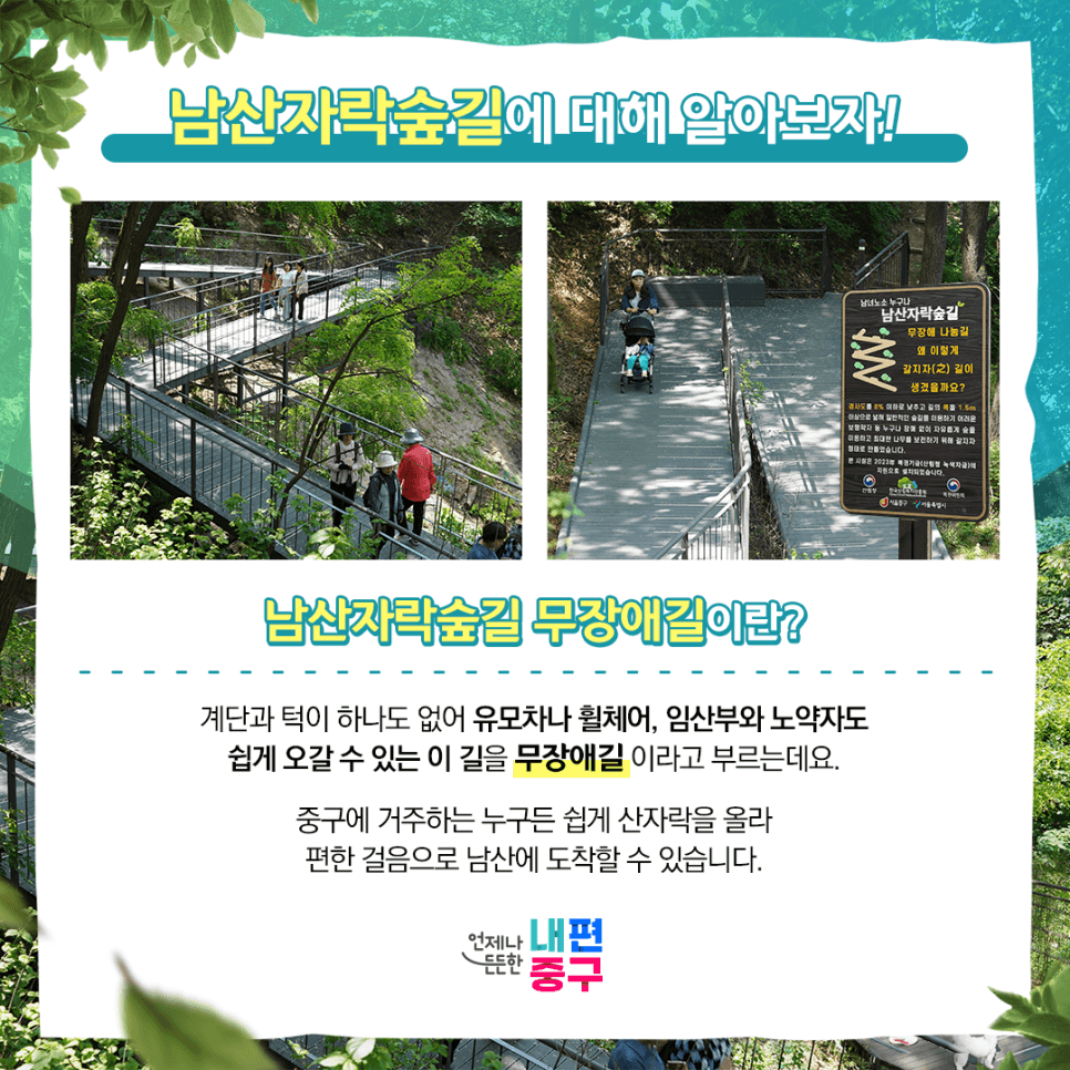 남산자락숲길 무장애길은 계단과 턱이 없어 유모차나 휠체어, 임산부와 노약자도 쉽게 오갈 수 있습니다.