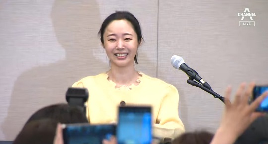 그룹 뉴진스 소속사 어도어 민희진 대표가 31일 두 번째 기자회견에서 화사한 노락색 카디건에 청바지를 입고 나왔습니다.