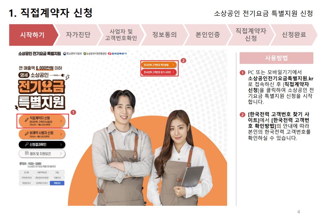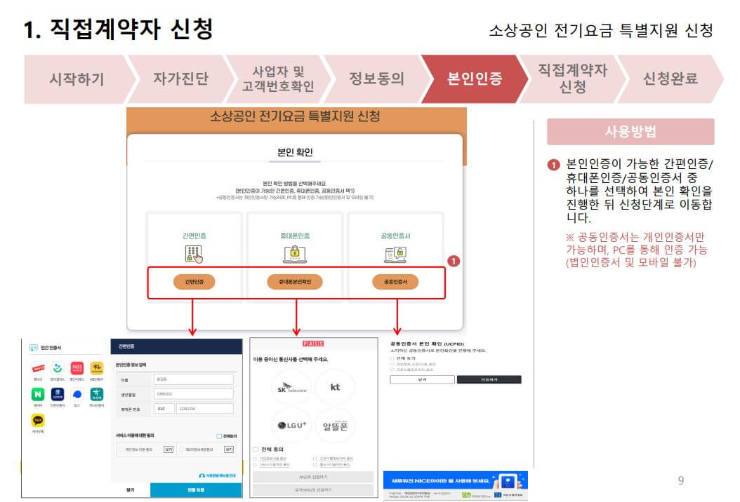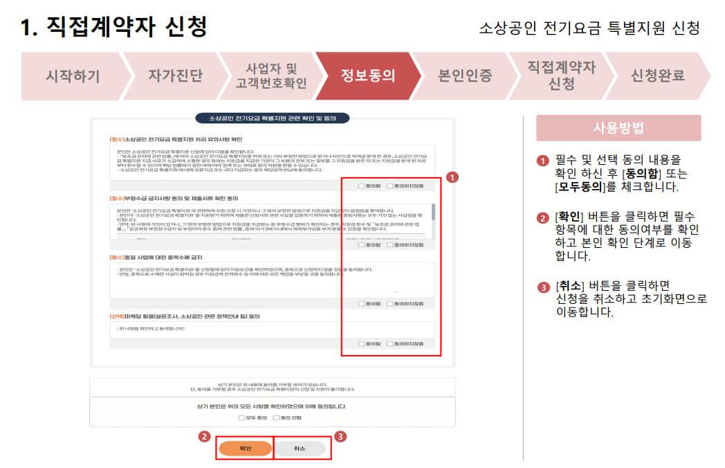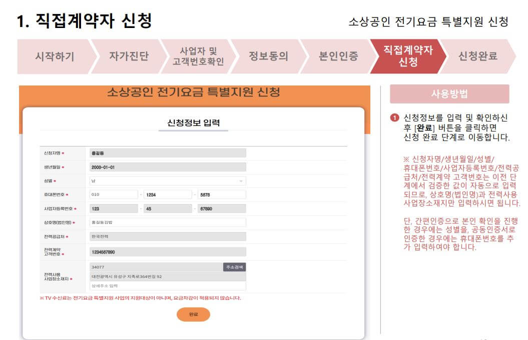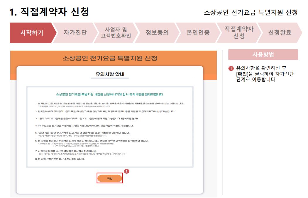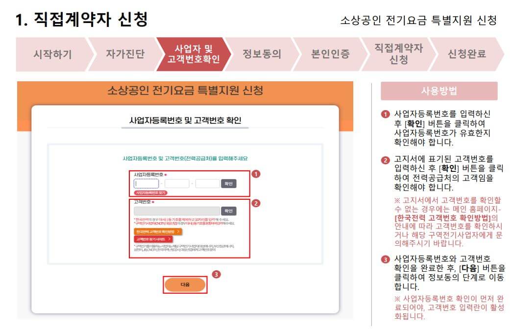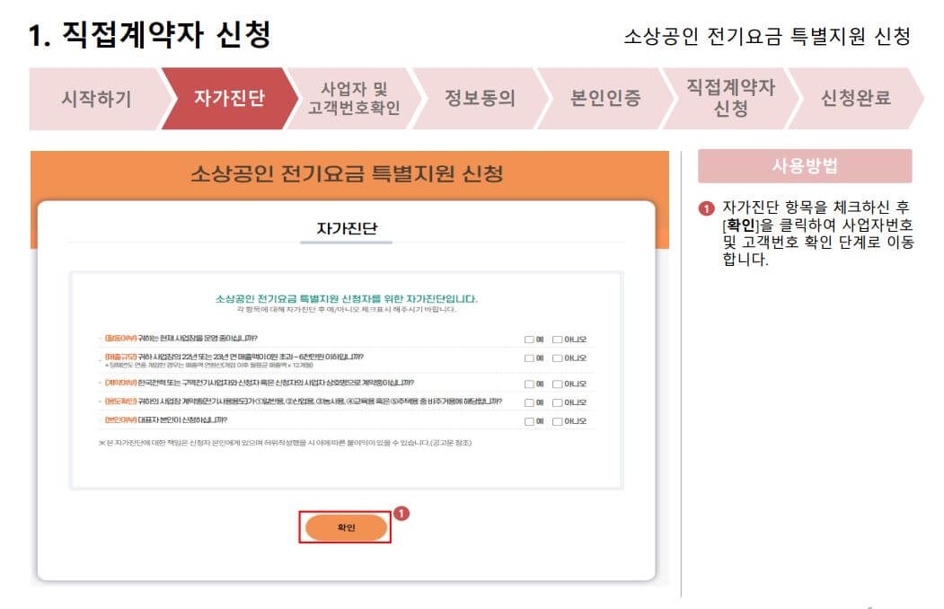 시작하기> 자가진단> 사업자 및 고객번호 확인하기> 정보동의 > 본인인증 > 직접계약자 신청하기 > 신청완료