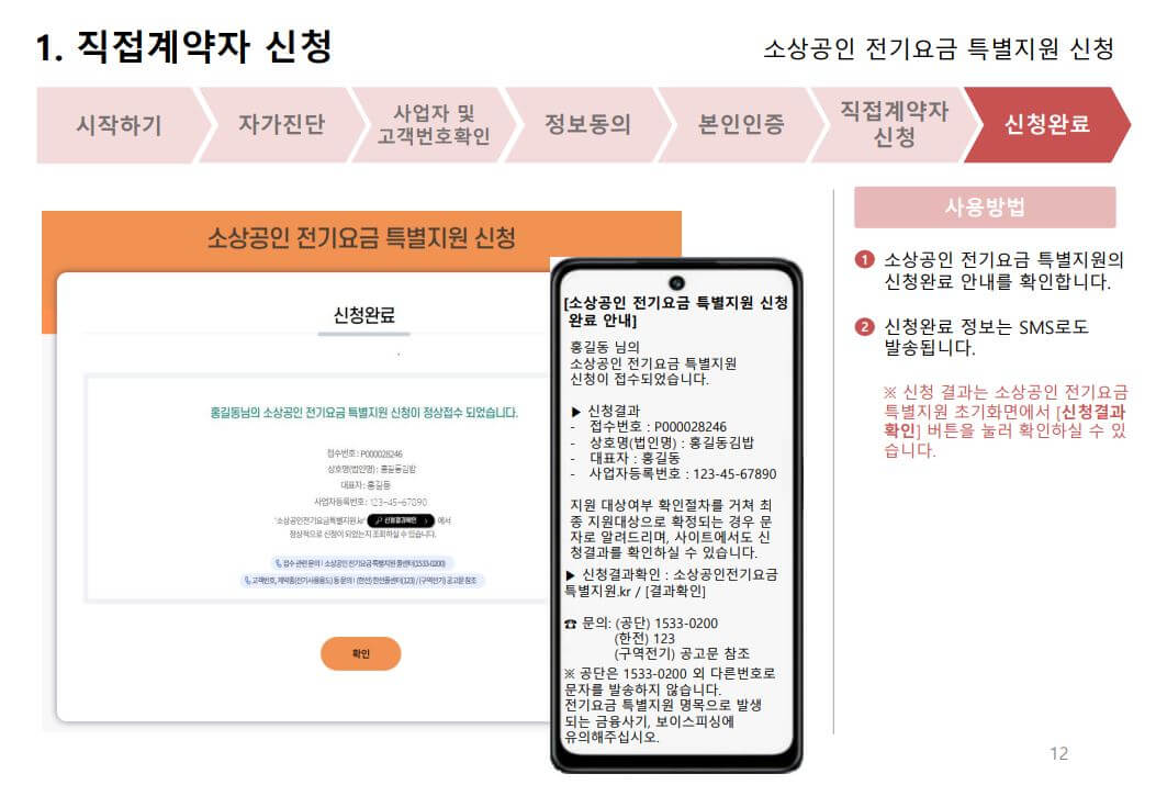 1. 소상공인 전기요금 특별지원의 신청완료 안내를 확인합니다.