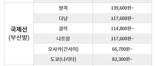 부산에서 출발하는 국제선 진마켓 항공권 가격입니다.