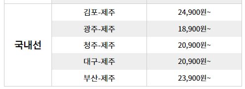 김포, 광주, 청주, 부산, 제주도 항공권 가격입니다.