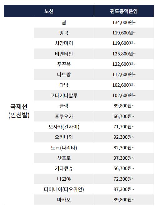 인천에서 출발하는 국제선 진마켓 항공권 가격입니다.