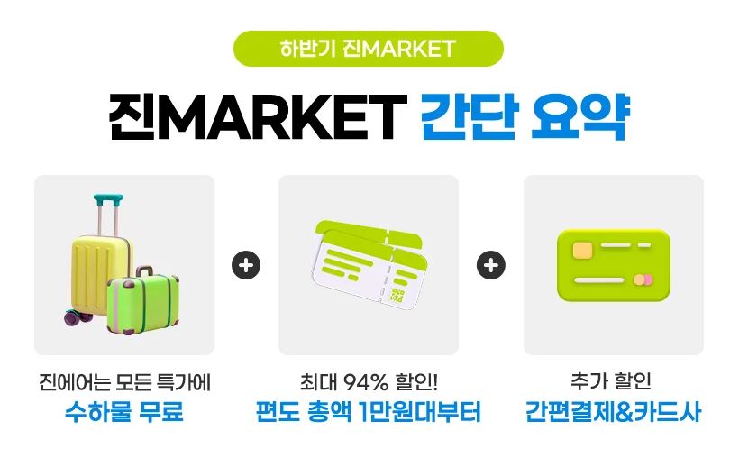 2024년 7월 16일 하반기 진에어 진마켓을 오픈했습니다. 1년에 딱 2번! 초특가 할인을 진행합니다.