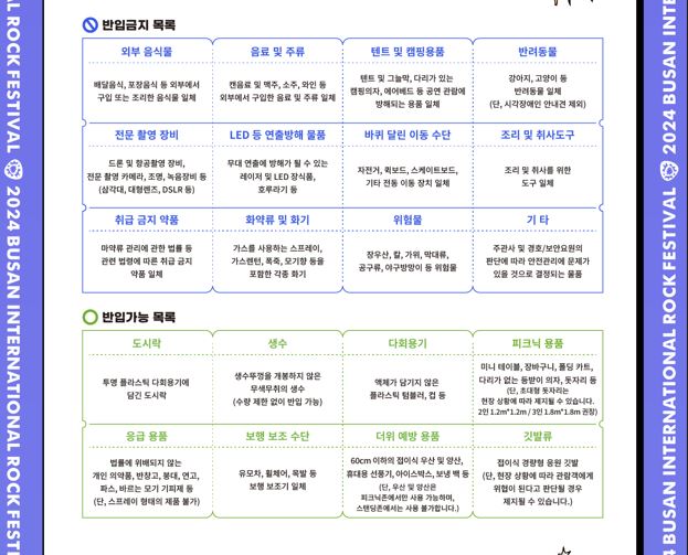 2024 부산국제록페스티벌은 반입 불가 목록이 아래와 같습니다.